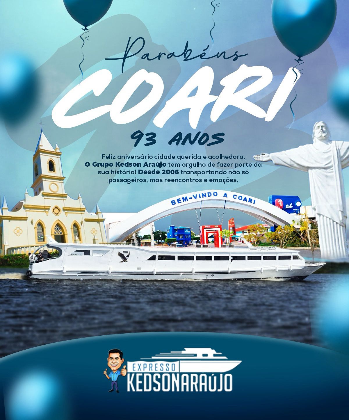 Neste dia especial, nosso coração se enche de orgulho por fazer parte dessa cidade maravilhosa. Obrigada por sempre nos acolher bem e viajarem conosco!! Parabéns minha amada Coari pelos seus 93 anos de história! Deus abençoe!❤️😍🎉